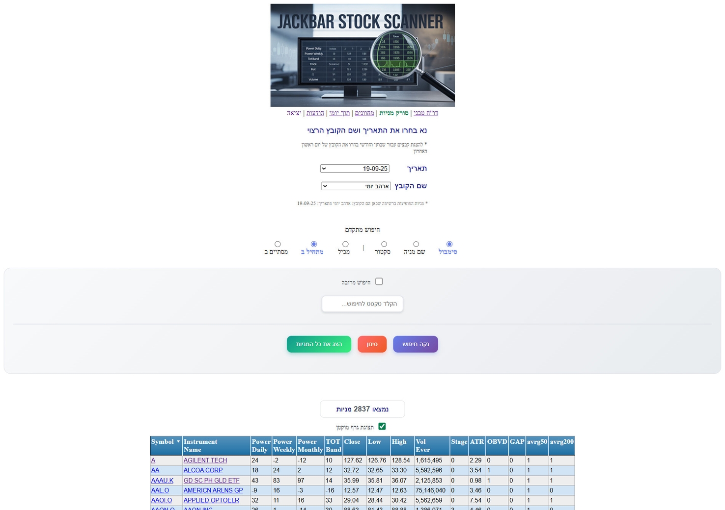הדבר השני הוא סורק המניות שמאפשר קבלת רשימת מניות לפי קרטריונים שאתם בוחרים כמו מניות שנמצאות כעת באחד מארבעת השלבים או מניות שהגיעו כעת לרמה עליונה או תחתונה של פער פתוחה (גאפ) ועוד. בסיס הנתונים כולל כ-2,800 מניות ותעודות סל שמחירן מעל $1 ומחזור מסחר מעל 500K מניות ביום וזאת מתוך כ-7,800 הקיימות בארצות הברית. בנוסף ישנם כ-450 מניות מישראל (ללא סינון) וכ-175 מדדים, סחורות ומטבעות.