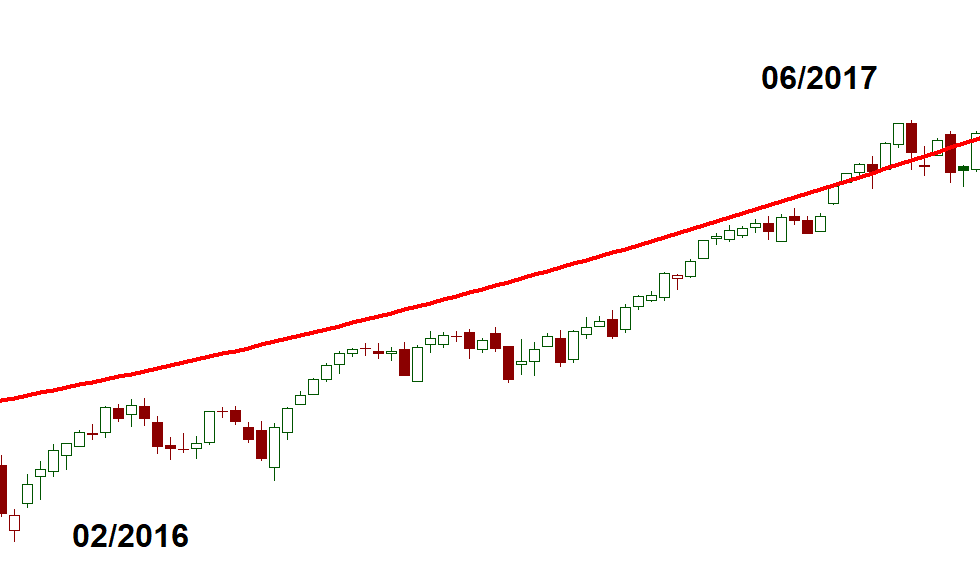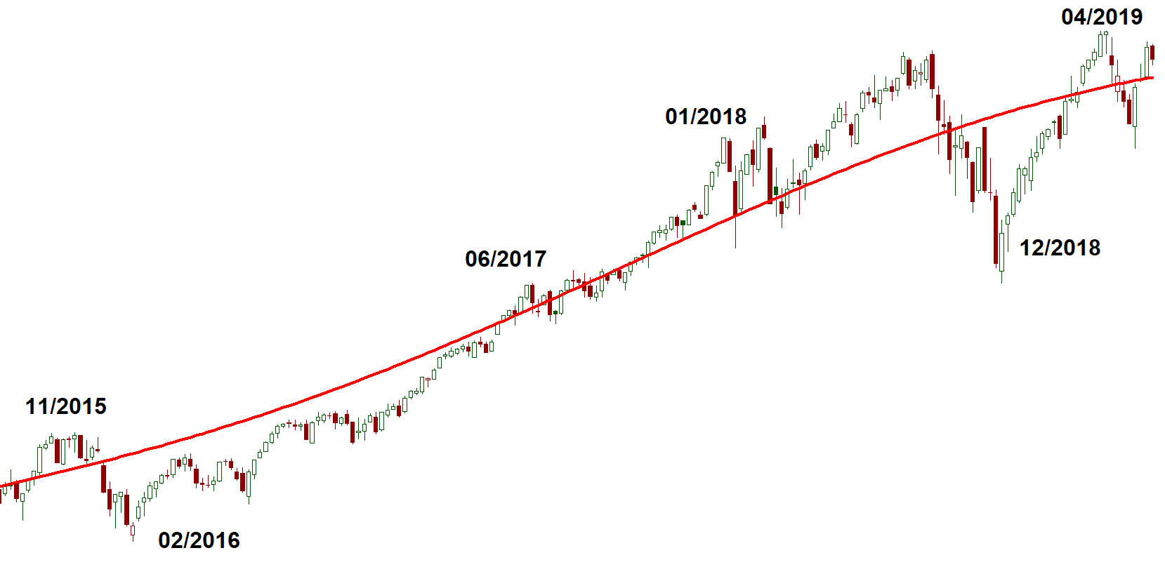 כעת נמתח עקומה דמיונית מנקודת שפל משמעותית של מניה לנקודת שיא משמעותית ותוכלו להבחין שהמניה נמצאת פעם מעל העקומה ופעם מתחתיו כמו בדוגמה הבאה על הנאסדק בשנים 2016-2019