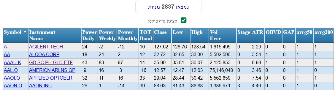 * עמודת ה-Power מעניקה את הציון לגבי הקיצון במניה כאשר מעל 70 או מתחת למינוס 70 המניה בקיצון וציון של 100 זהו מצב TOT